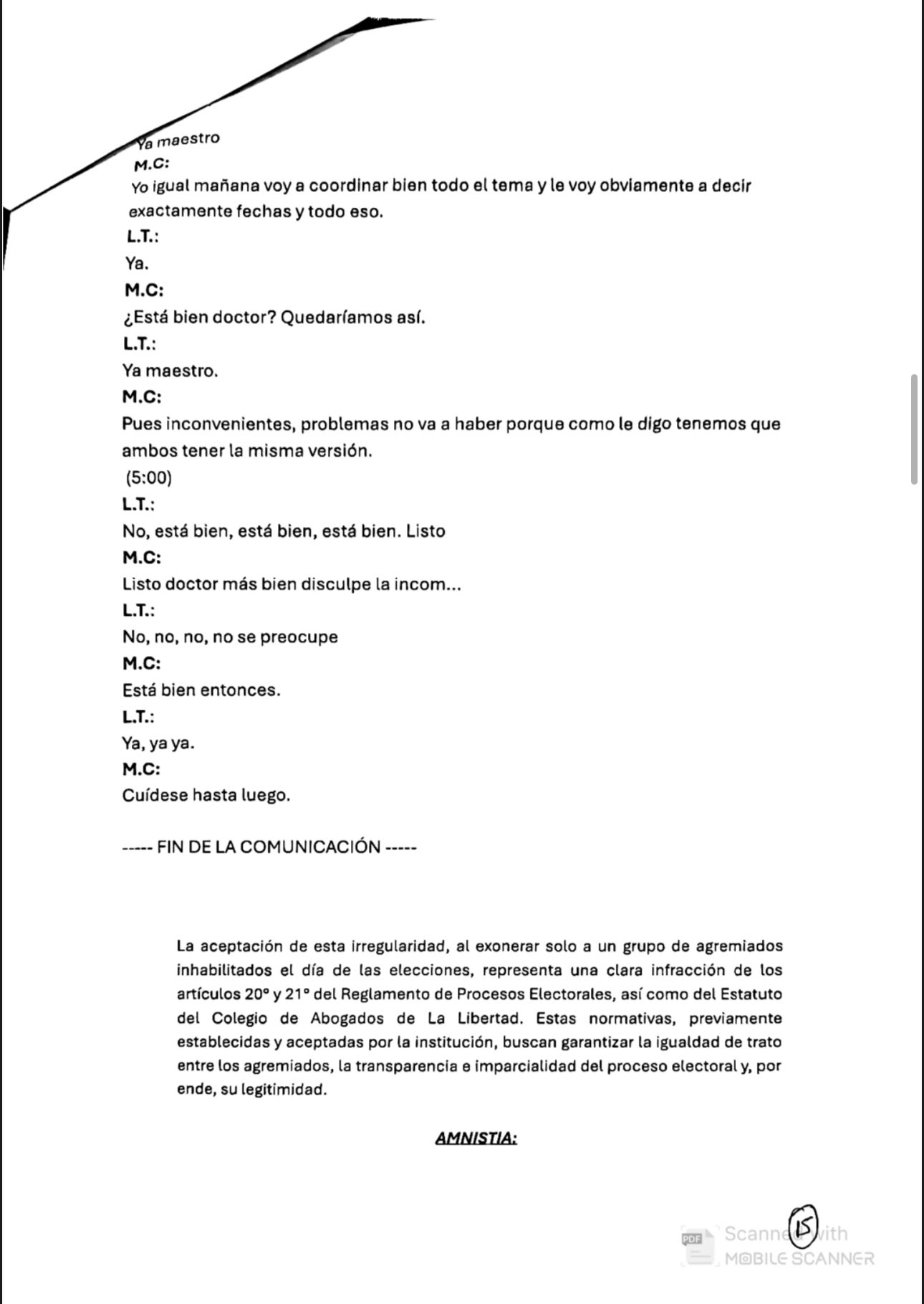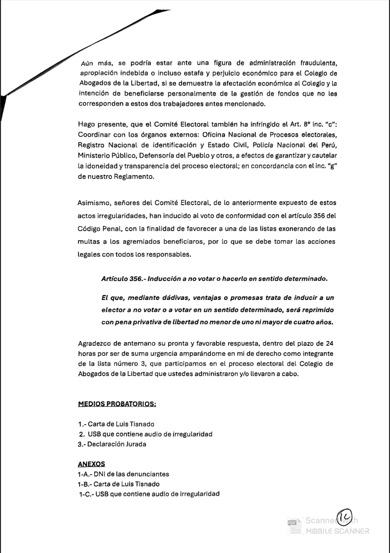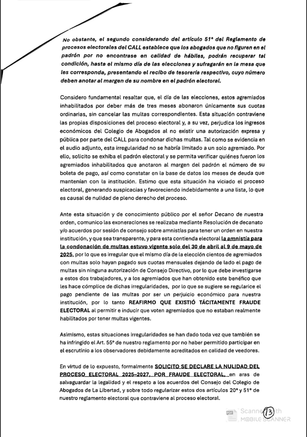 Frente a este panorama, la Lista N.º 3 solicitó la nulidad de las elecciones 2025-2027 por contravenir los principios de legalidad, equidad y transparencia. El documento presentado al Consejo Directivo del CALL cuenta con 22 folios y una lista de anexos probatorios, entre ellos audios, DNI, cartas firmadas y recibos de pago.