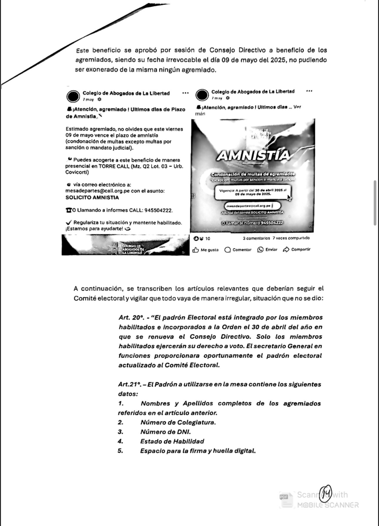 Esta acción contraviene directamente lo establecido por el propio colegio, que a través de una resolución de decanato había autorizado una amnistía del 30 de abril al 9 de mayo de 2025 para regularizar deudas, según se indica. La exoneración fuera de este plazo no solo viola los plazos establecidos, sino que también habría servido como incentivo para captar votos a favor de una lista específica: la Lista N.º 7 que encabezaba el abogado Mario Deza.