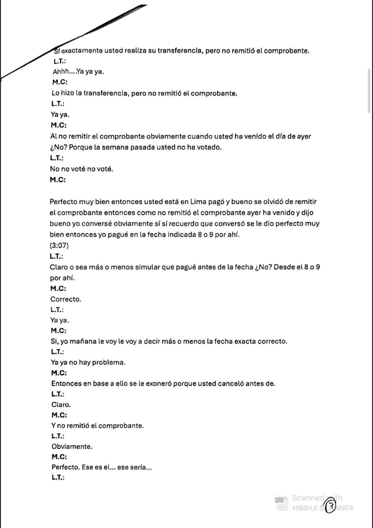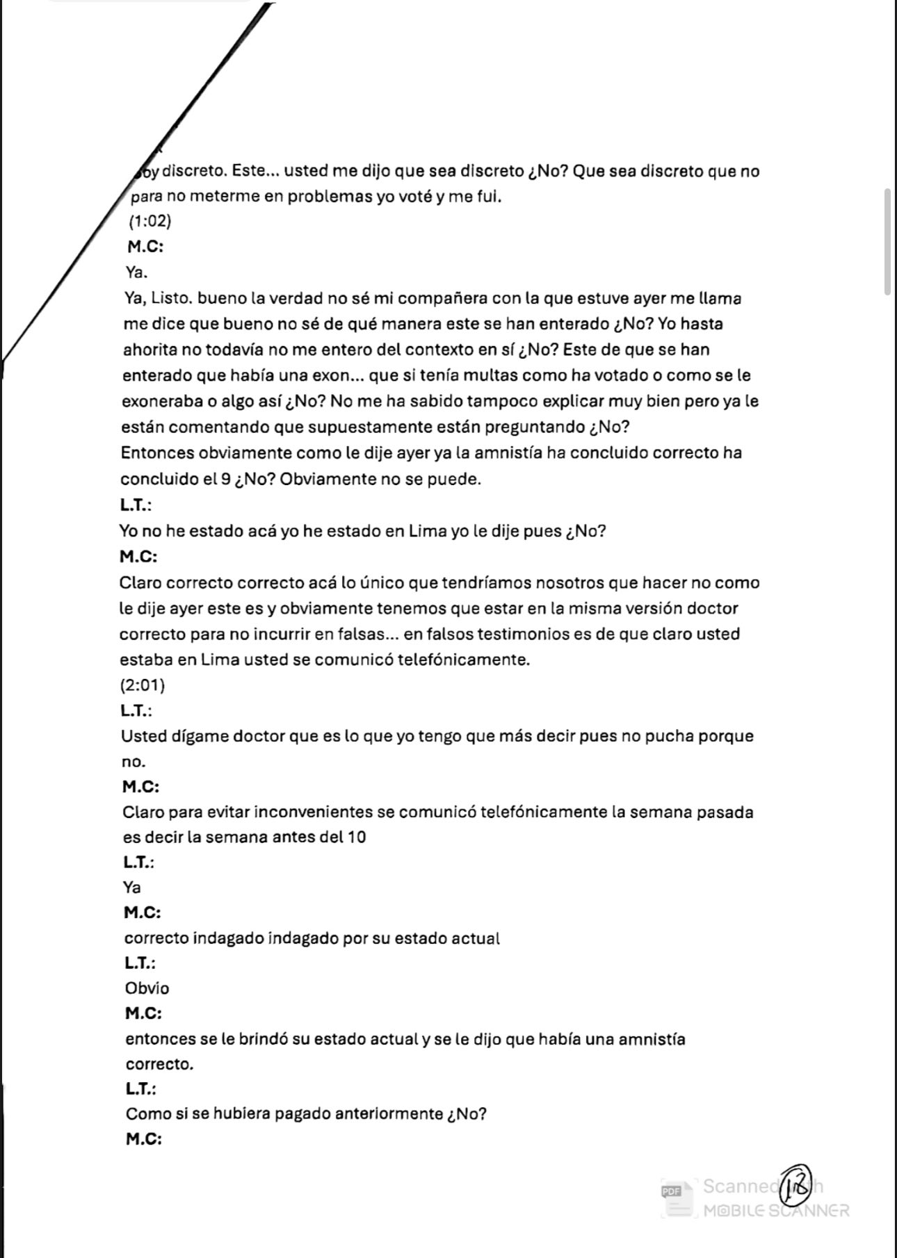 La denuncia está respaldada por pruebas contundentes: Declaración jurada del abogado Luis Tisnado Solís (Reg. CALL 5425), quien asegura que fue inducido a permitir el voto de agremiados no habilitados; grabaciones de audio en las que se escucha a trabajadores del CALL, incluyendo a Martín José Miguel Castro Burquet, coordinar versiones con terceros para encubrir lo ocurrido; mensajes de WhatsApp que evidencian la presión e intento de manipulación; comprobantes de pago por Yape a nombre de la tesorera Mirella Lizbeth Ramos Luján, lo cual genera aún más sospechas sobre una gestión paralela e informal de las regularizaciones.