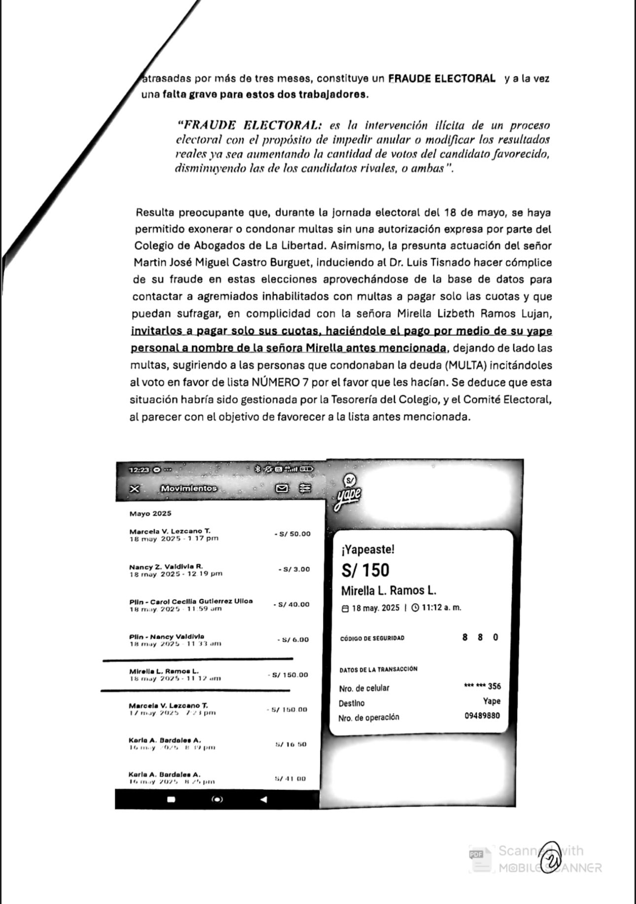 Uno de los documentos más llamativos muestra una transacción vía Yape por S/ 150 soles realizada el mismo día de las elecciones, supuestamente para cubrir cuotas ordinarias y permitir el voto, dejando de lado las multas reglamentarias.